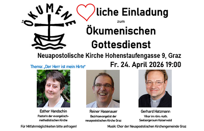 am Freitag, 24. April 2026 um 19:00 Uhr in derNeuapostolischen Kirche Graz Thema: „Der Herr ist mein Hirte“