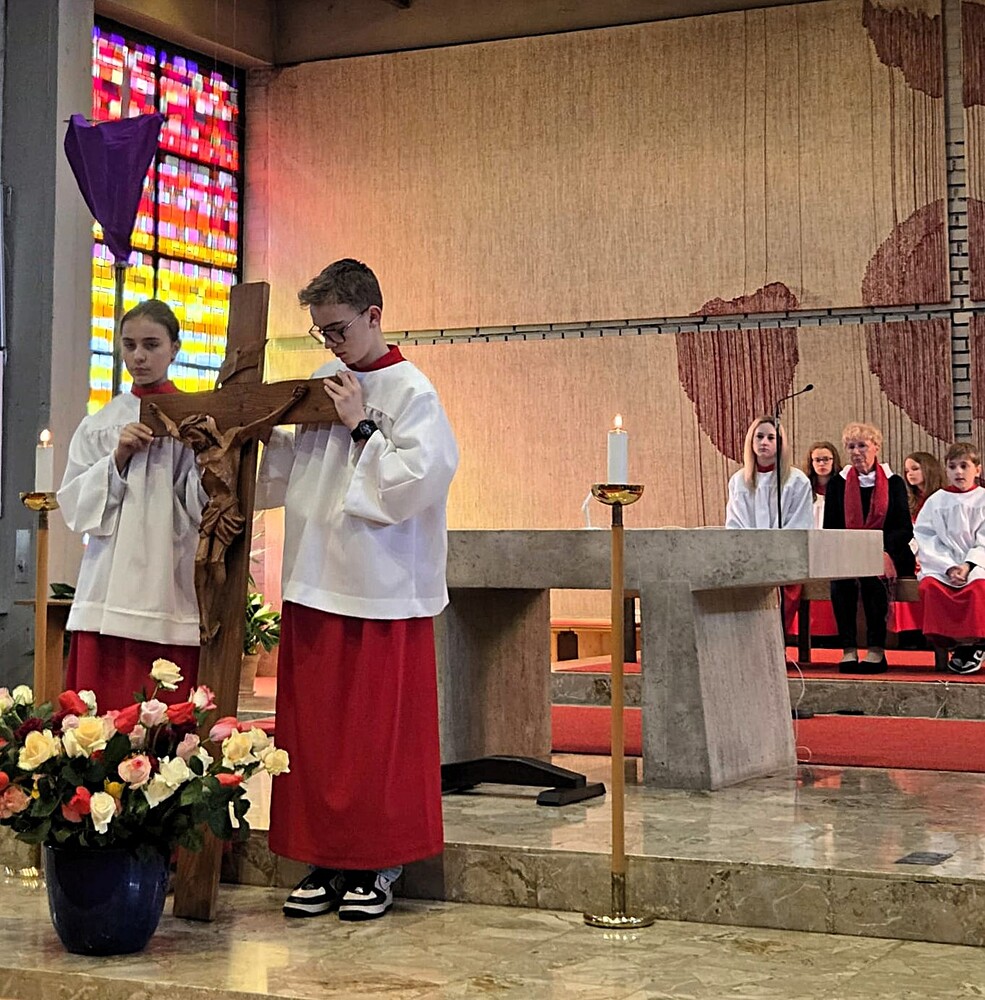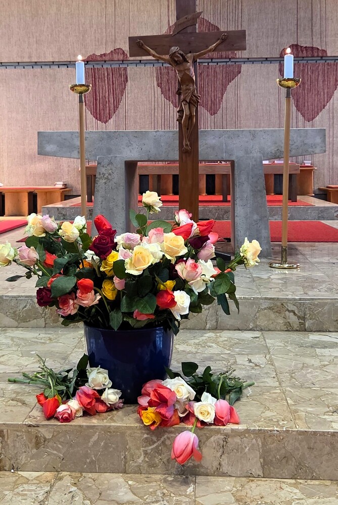 KARFREITAG Etliche Gläubige dachten in der heutigen Karfreitagsliturgie - gemeinsam Lieboch mit Tobelbad und geleitet von Wort-Gottes-Feier-Leiterin Maria Possert - an den Leidensweg, an die Kreuzigung und an den Tod Jesu. Die großen Fürbitten trugen die Anliegen der Kirche, der Welt und der Notleidenden vor Gott. Das verhüllte Kreuz wurde in 3 Stationen in den Altarraum gebracht und dabei mit den Worten "Seht das Kreuz, an dem der Herr gehangen, das Heil der Welt" enthüllt. Nach der Kreuzverehrung mit bereitgestellten wunderschönen Blumen schloss die Feier mit dem Segen. Susanne Linhardt, Pastorales Pfarrteam Tobelbad Liturgie