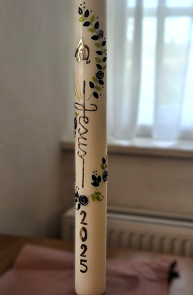 OSTERKERZE Wir vom Generationentreff haben heuer die ehrenvolle Aufgabe übertragen bekommen, unsere Osterkerze zu gestalten. Wir sehen uns als ein Bindeglied zwischen den Generationen und wollten dies in der Osterkerze zum Ausdruck bringen. Mit viel Herzblut vereinten wir moderne, frische Elemente mit alten, ehrwürdigen Traditionen. So symbolisiert das Kreuz, das unser Herr Jesus Christus für uns getragen hat, sein großes Opfer und seine unendliche Liebe. Die Blumen und Blätter stehen für das junge, heranwachsende Leben, das in der Auferstehung erblüht und uns Hoffnung schenkt. Möge diese Kerze ein strahlendes Licht der Hoffnung und des Glaubens für uns alle sein. Alexandra Deutsch, Generationentreff