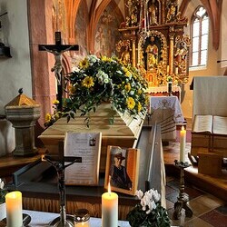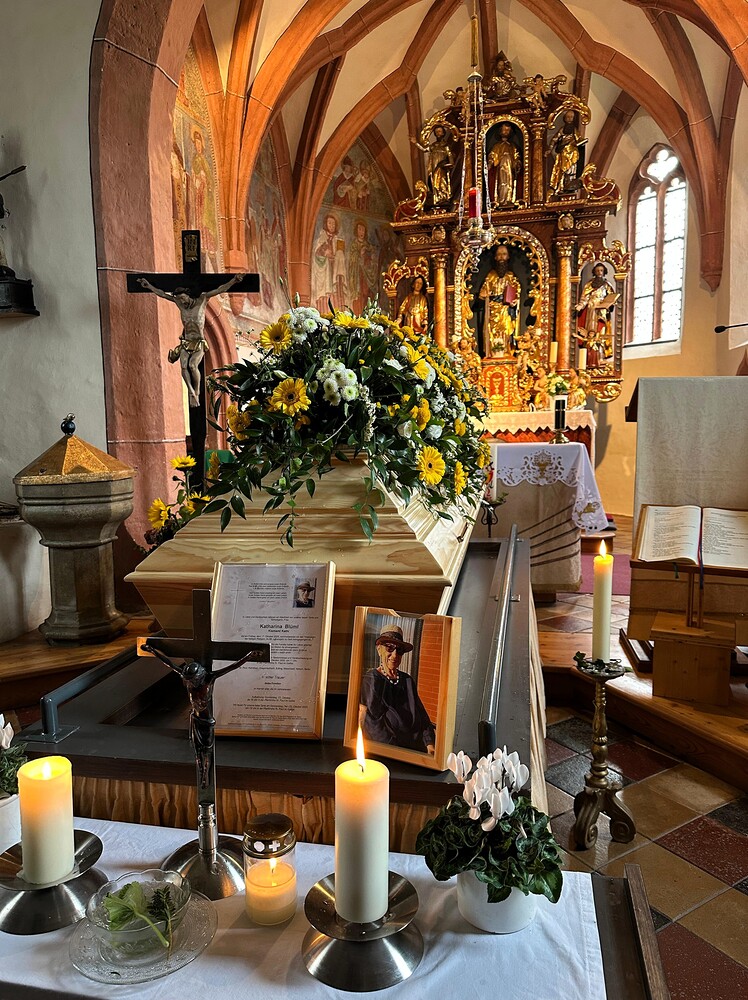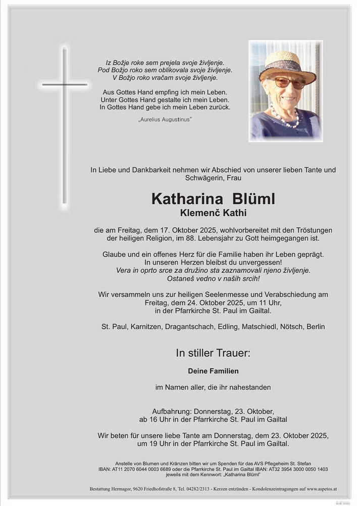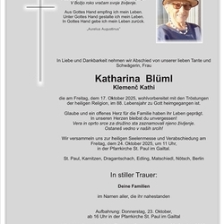 Wir blicken mit Dankbarkeit auf ihr segensreiches Wirken zurück. Katharina Blüml hat in vielen Herzen Spuren hinterlassen – Spuren des Glaubens, der Hoffnung und der Liebe. „Was wir lieben, bleibt – denn Liebe überdauert den Tod.“ In liebevoller Erinnerung die Pfarrgemeinde Tobelbad, Freundinnen und Weggefährtinnen, sowie alle, die sie auf ihrem Lebensweg begleitet hat. Margret Hofmann, Susanne Linhardt - Pastorales Pfarrteam Liturgie