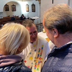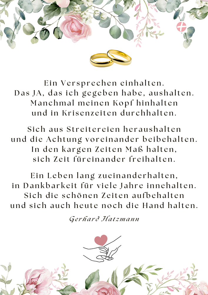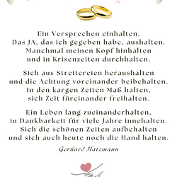 Zum Abschluss schenkte Christa den Paaren einen Segenstext von Vikar Gerhard Hatzmann. Der Text stammt aus dem Billetsortiment "Hoffnung in Wort und Farbe", das Vikar Gerhard Hatzmann und Gertrude Macek für die Spendenaktion zugunsten der Hospizstation St. Elisabeth gestaltet haben.