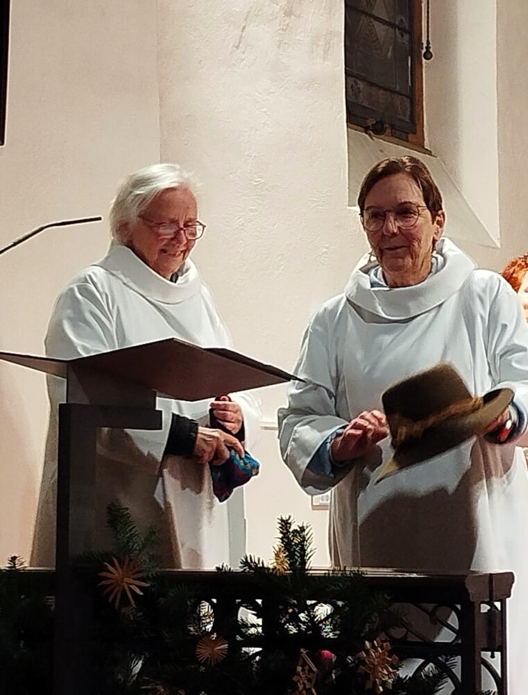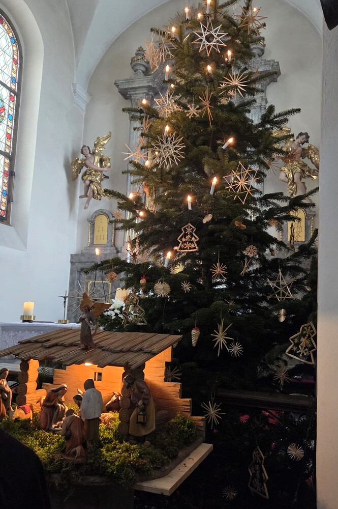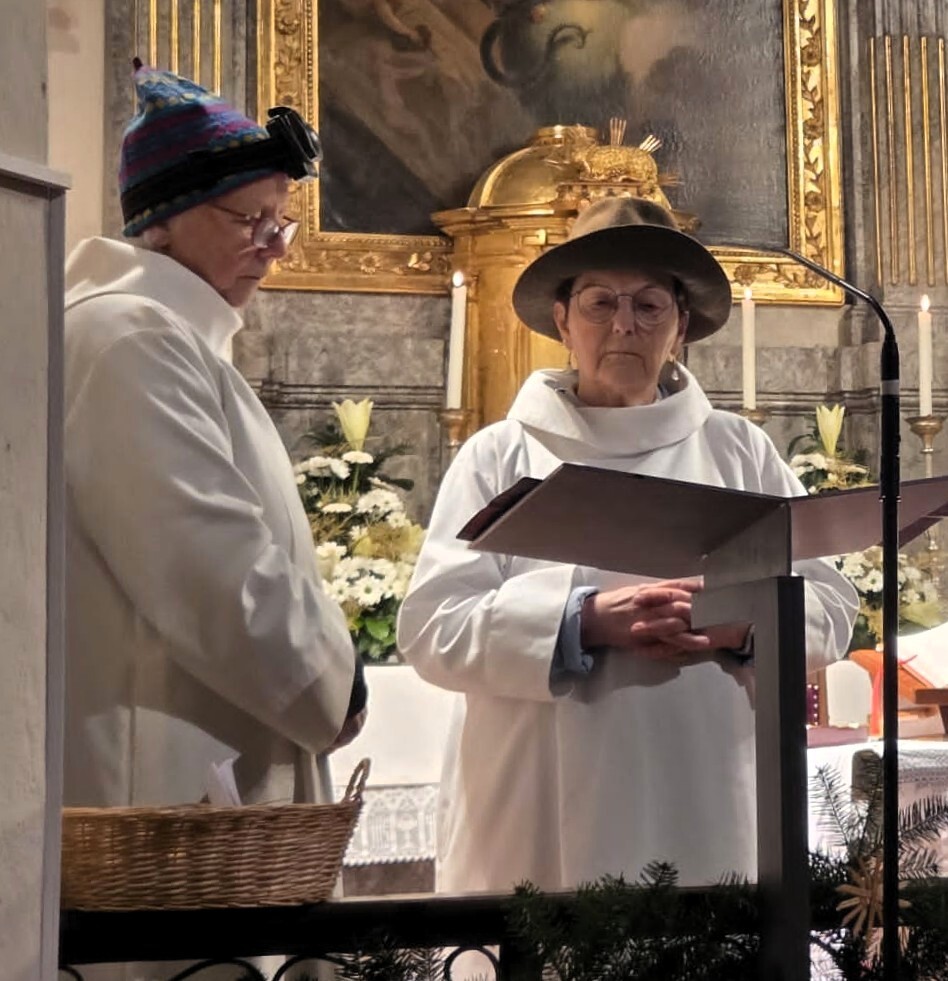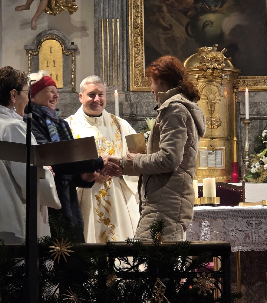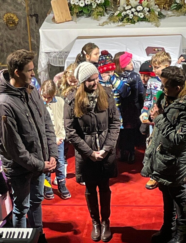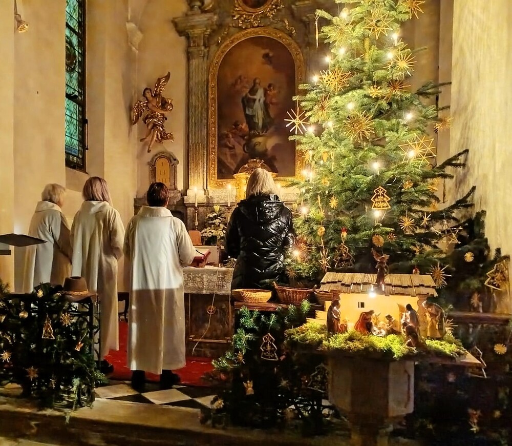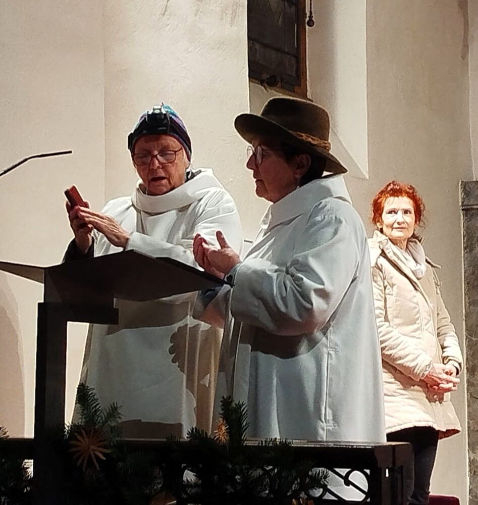 Christmette als Wort-Gottes-Feier Vor der Krippe ließen wir die Zeiten verschwimmen: Susi Linhardt als Hirtin der Antike, Margret Hofmann als moderne Hirtin mit GPS und Stirnlampe. Ines Kvar fasste als Engel die Botschaft zusammen: Jesus bringt Heil für alle – ob sichtbar oder unsichtbar. Für weihnachtliche Stimmung sorgten Herta Finster mit der Querflöte und ihr Mann Robert an der Orgel. Heidi Reinprecht hatte bei der Mette ihren ersten Einsatz als Mesnerin. Mit ihr schauen wir zuversichtlich ins neue Jahr. Danke auch dem Turmbläsertrio für die Begrüßung all jener, die sich trotz Schneegestöbers auf den Weg zur Mette gemacht haben.