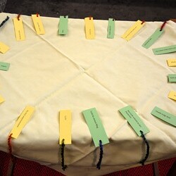 Der Schirm, mit dem ich die Wort-Gottes-Feier eröffnet habe, zeigt auf seiner Innenseite zwei Frauengestalten (im Foto mit blauem Pfeil gekennzeichnet): die Weisheit und die Kirche. Die Weisheit wird in der antiken Tradition mit dem „Logos“, dem Wort Gottes, verbunden – jenem Wort, mit dem nach dem Johannesevangelium die Schöpfung beginnt: „Im Anfang war das Wort“. Darauf gründet Susanne Linhardt in ihren Worten zum Evangelium ihr Plädoyer für die Wort-Gottes-Feier. In der Zeichenhandlung sind alle eingeladen, eines der Wortkärtchen mitzunehmen als Zeichen dafür, dass das Gottes Wort auch ihnen gilt. Margret Hofmann, Wort-Gottes-Feier-Leiterin